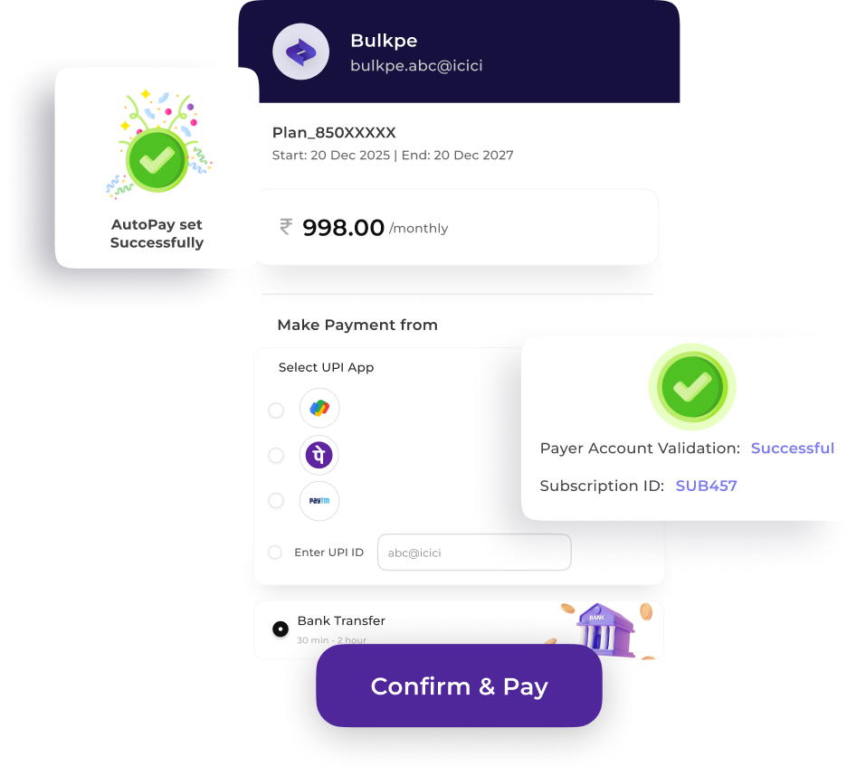 Secure, compliant recurring payments delivered instantly with full NPCI compliance.
